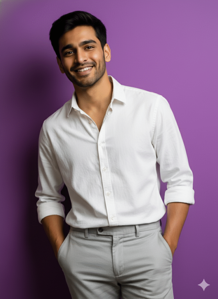A stylish 4K portrait of a man with a confident smile, wearing a loose white button-up shirt, light gray pants, and hands in pockets against a solid purple wall. Perfect for a modern, relaxed vibe.